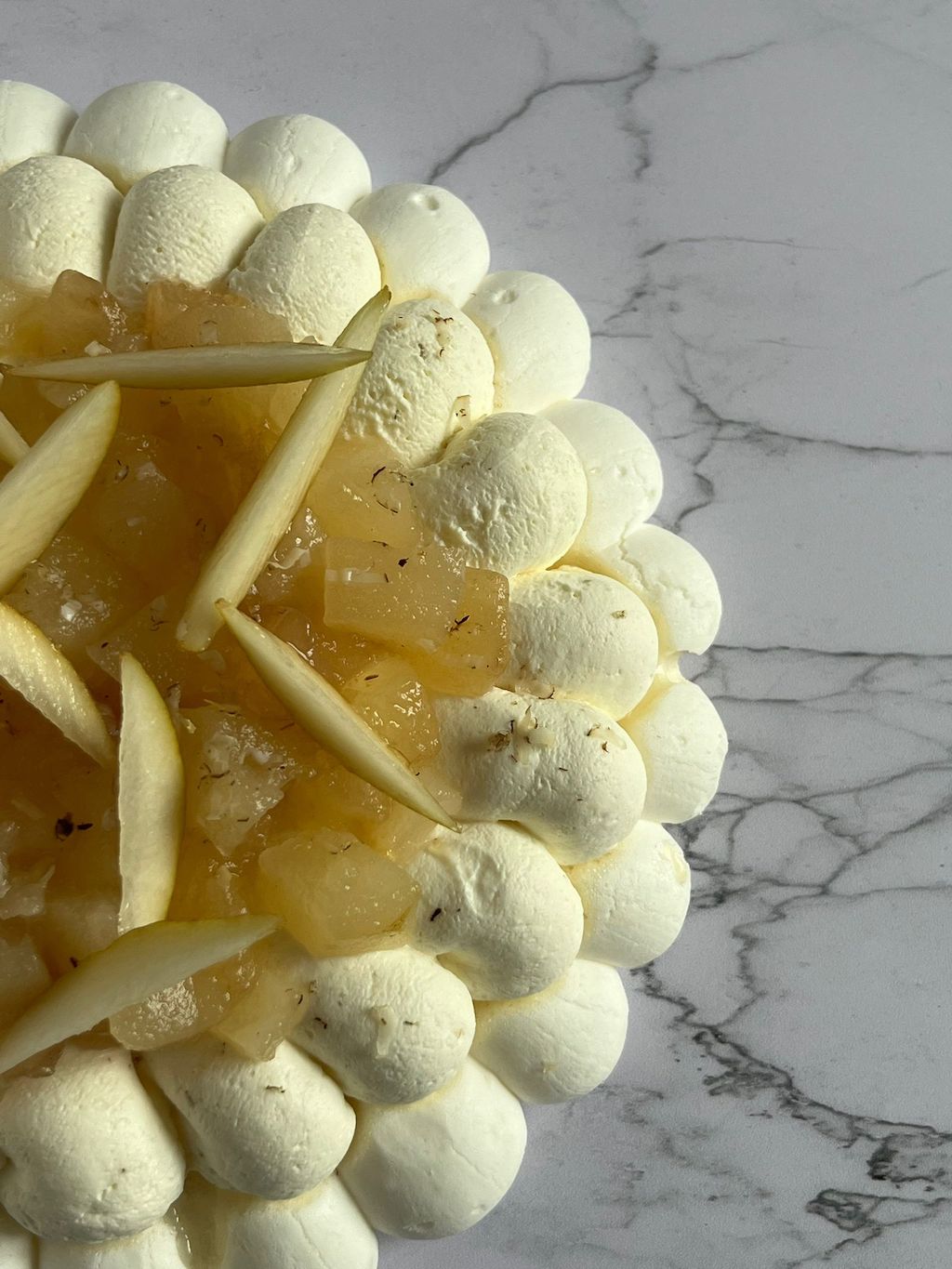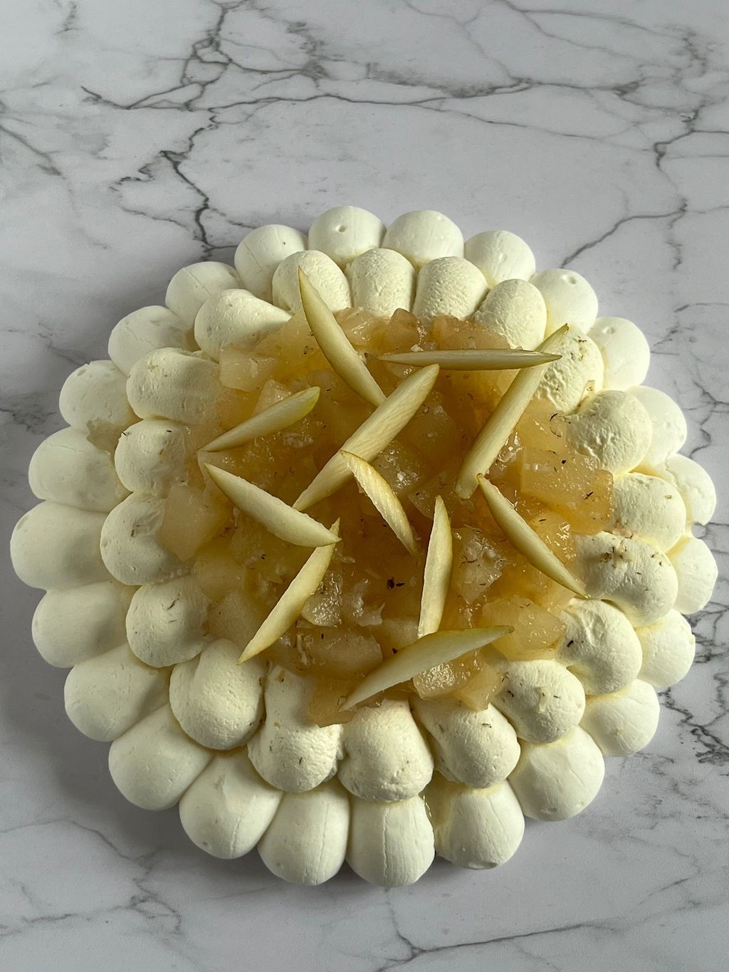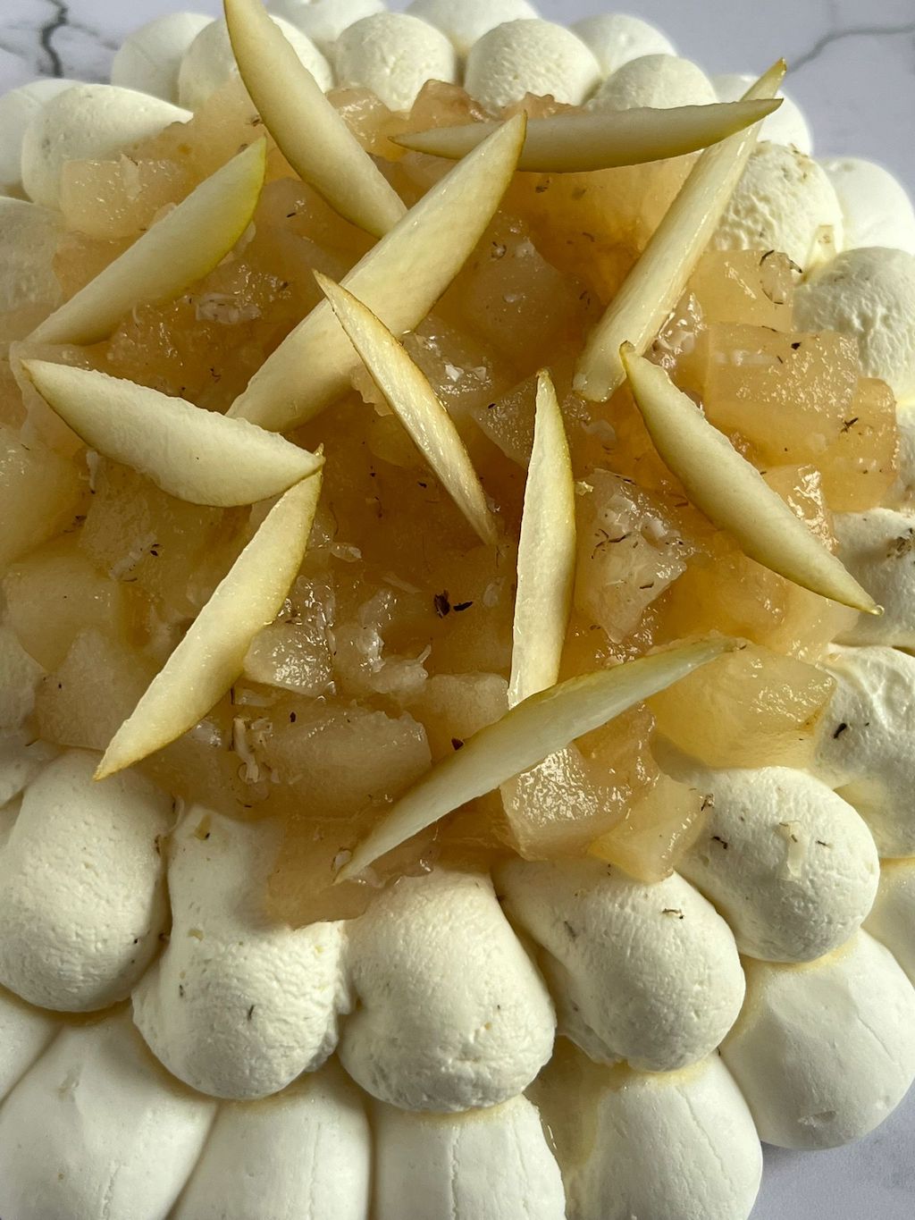 Laissez-vous séduire par la délicatesse de notre pavlova à la poire et à la fève tonka. Cette création légère et aérienne combine la douceur d’une meringue croustillante, des poires juteuses et parfumées et une crème chantilly subtilement parfumée à la fève tonka pour la gourmandise.