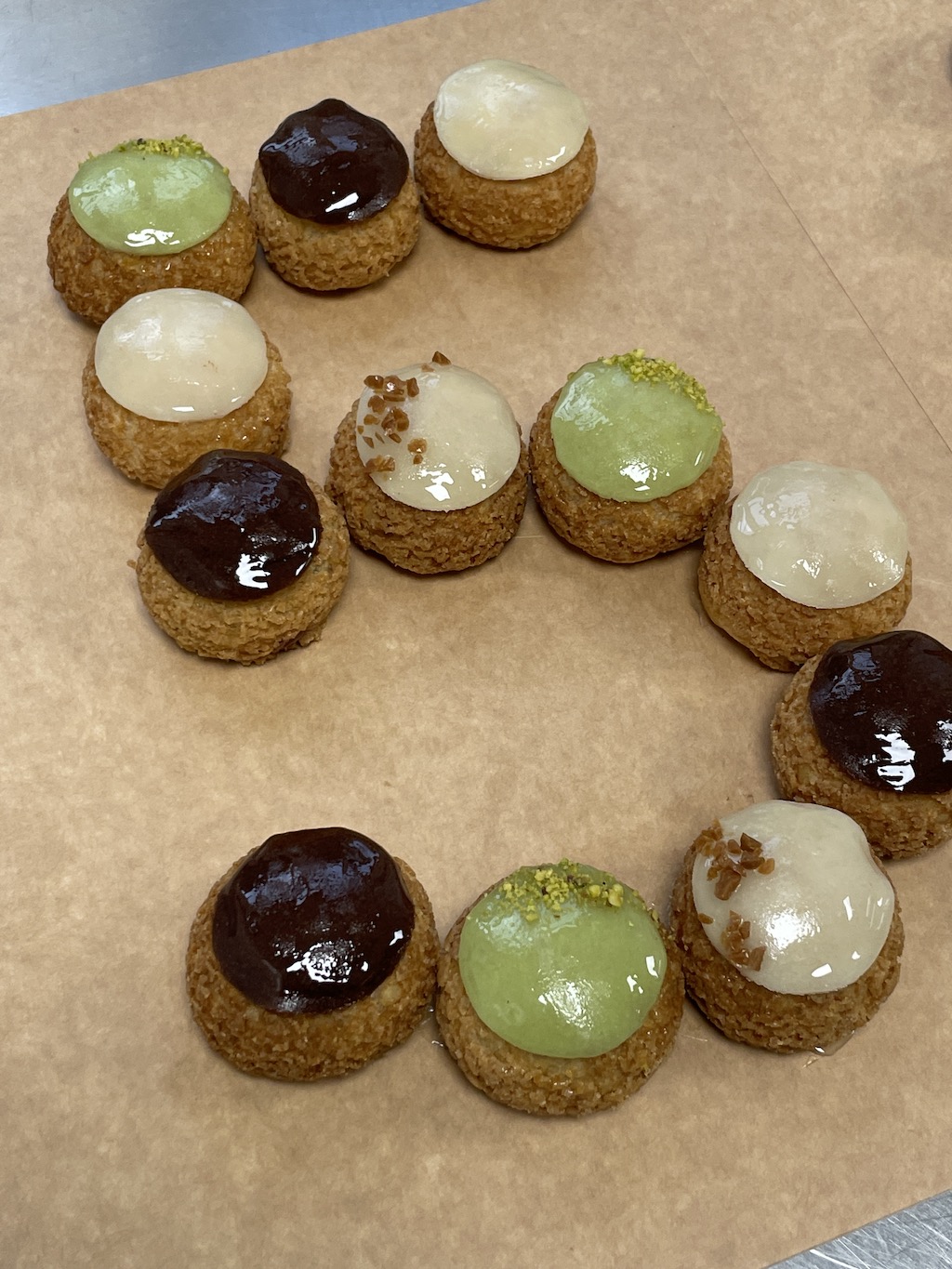 Allergènes : oeufs, beurre, lait, crème, noisettes (pour les choux praliné), pistache (pour les choux pistache)